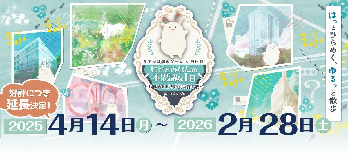 日比谷の街を舞台に開催される周遊型のリアル謎解きゲームです。白くて可愛い不思議な生き物「ヒビ」と出会い、物語の主人公として街を巡りながら謎を解き進めていきます。エリアごとに用意されたコラムでは、日比谷の歴史や街の魅力にも触れることができ、体験と知識が重なり合う内容となっています。好評につき開催期間の延長が決定しています。